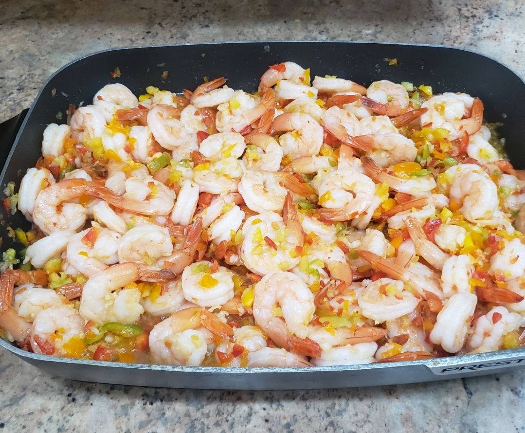 When I want a quick simple and delicious meal I make this mouthwatering shrimp salad. This delicious meals is made with olive oil, garlic, peppers and onions .